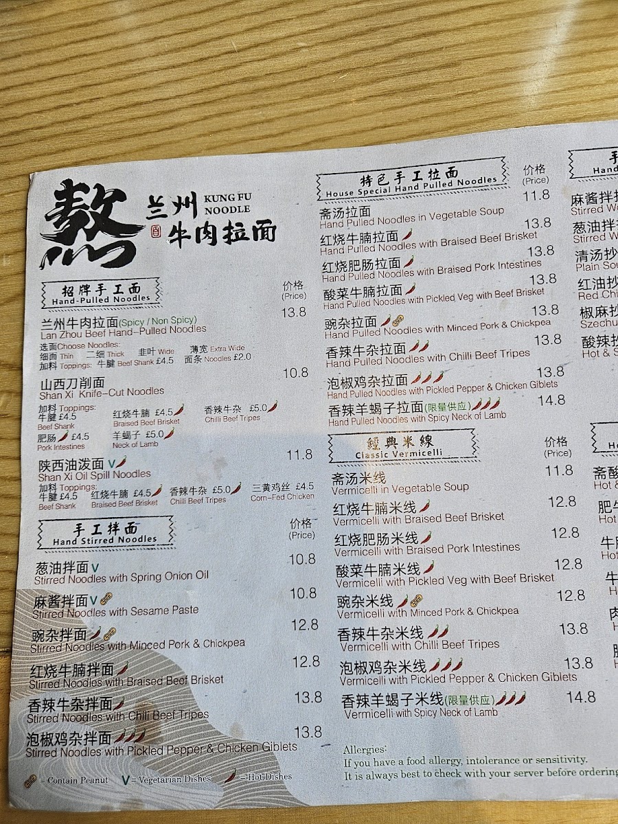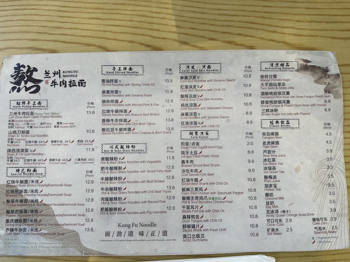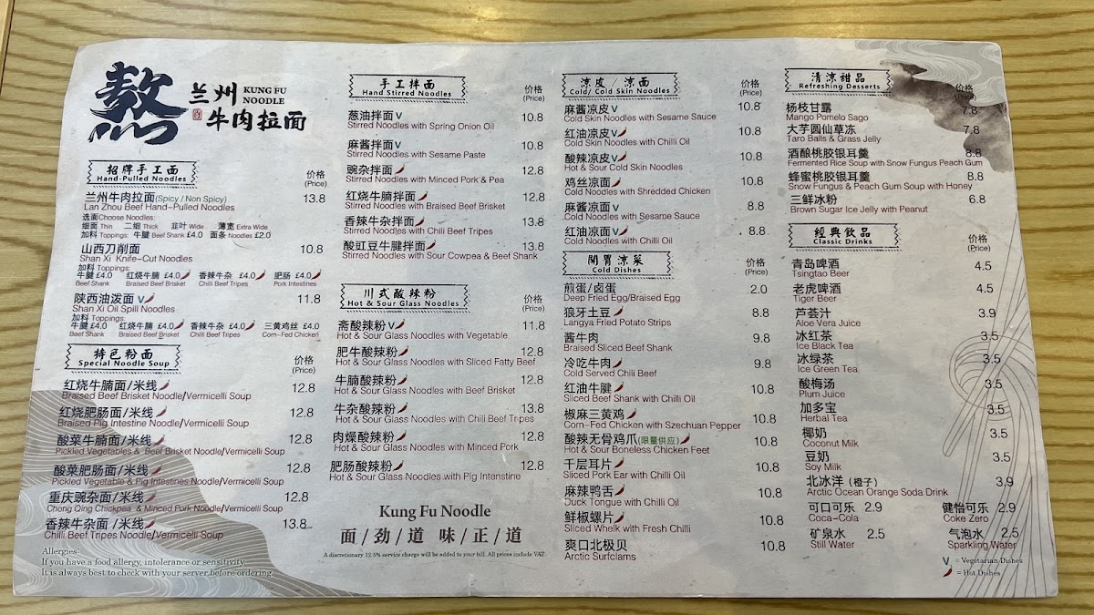 Welcome to Kung Fu Noodle, nestled in the vibrant heart of London’s Chinatown at 64 Shaftesbury Ave. Here, hand-pulled noodles are the star attraction, especially the renowned 兰州牛肉拉面, priced at just £13.80. The menu invites you to personalize your dish with tantalizing options like Braised Pork Intestines and Raised Beef Brisket, all priced around £4.50 each.